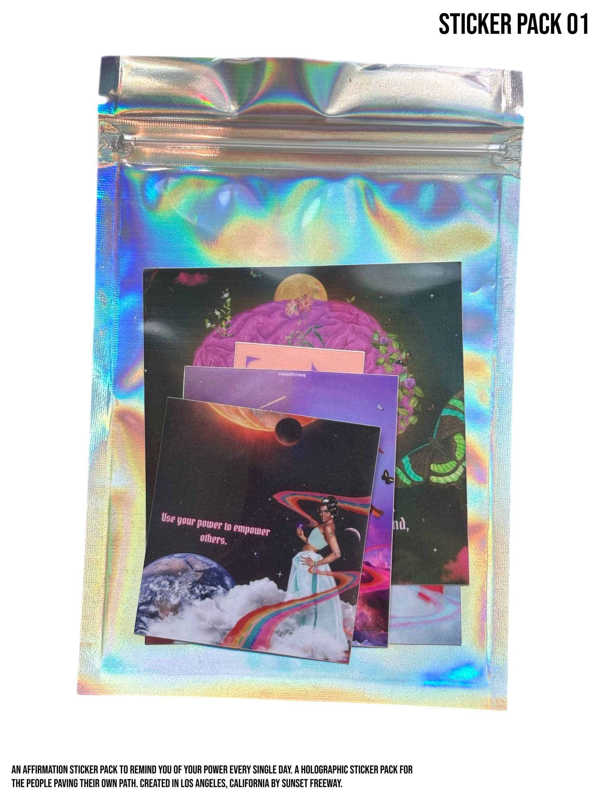 Gentle reminder stickers that serve as visual meditations for your laptop, iPad, water bottle, or desk. Each pack includes 5 stickers, 3 holographic and 2 vinyl, to help keep your goals and the feeling of attaining them in mind. Limited packs available on a first come, first serve basis. Created by Sunset Freeway in Los Angeles, California.